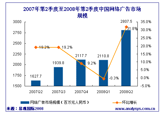 易觀國際研究顯示,2008年第2季度網絡廣告高速增長的原因主要由兩方面構成,一方面,突破了淡季影響,另一方面,受到北京2008奧運會的推動,以奧運贊助商為主體的65家廣告主以及其他相關品牌廣告主相繼加大了對于網絡營銷的投入,需要指出的是地震等突發事件并沒有對品牌廣告主的廣告投放造成較大影響,網絡游戲、IT數碼等與娛樂性強相關的行業廣告主在第2季度的網絡廣告投放有所減緩,但總體影響不大。