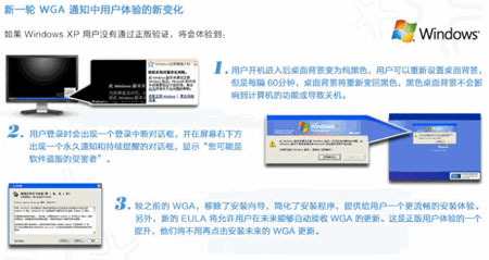 據了解,為打擊盜版,微軟在2007年3月就在中國推出了Windows正版增值計劃,而Office的正版增值計劃OGA是首次在國內發布,這兩個驗證工具可以自動檢測驗證用戶電腦上安裝的Windows XP和Office是否為正版軟件。如果使用了盜版軟件,用戶會不斷收到正在使用盜版軟件的提示,未通過正版驗證的Windows XP將黑屏。