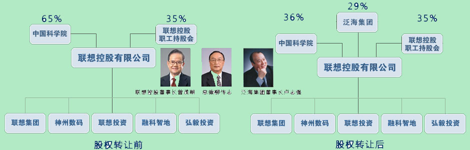 引入中國泛海后,聯想控股原股權結構為:國科控股占65%,聯想控股職工持股會占35%。此次股權轉讓后,聯想控股新的股權結構為:國科控股占36%,仍為聯想控股第一大股東,聯想控股職工持股會占35%,中國泛海占29%。