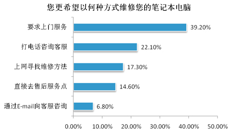 此外,有39.2的用戶,尤其是女性用戶,希望當筆記本電腦出現故障時,能夠得到上門服務。不過也有用戶表示,上門服務費用對個人用戶來說太貴了。