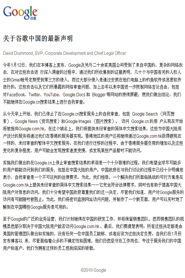 該聲明稱,今年1月12日,曾在官方博客上宣布,Google及另外二十余家美國公司受到了來自中國的、復雜的網絡攻擊,在對這些攻擊進行深入調查的過程中,通過所收集到的證據表明,幾十個與中國有關的人權人士的Gmail帳號定期受到第三方的侵入,而這大部分侵入是通過安裝在他們電腦上的釣魚軟件或惡意軟件進行的。這些攻擊以及所暴露的網絡審查問題等,讓谷歌做出結論,將不再繼續在Google.cn搜索結果上進行自我審查。