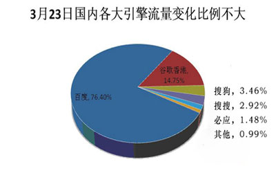 根據中國知名的獨立第三方數據統計分析服務提供商CNZZ統計的數據顯示,3月23日、24日,我國網民通過baidu.com和google.com.hk進行搜索的訪客比例分別穩定在76%和14%左右。