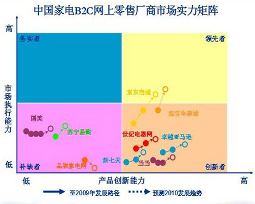 據易觀國際近期發布的《中國B2C網上零售市場年度綜合報告2010》研究顯示,中國家電B2C市場呈現多方陣營的格局,其中以淘寶為代表的平臺商,以及以京東商城、世紀電器網為代表的零售商城都積極地進行了市場布局,但是以國美和蘇寧為代表的傳統的連鎖賣場在網上零售市場發力遲緩。