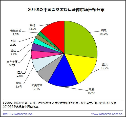 第二季度騰訊(0700.HK: 行情)網游市場份額最大,占27.2%,遙遙領先昔日翹楚盛大(GAME.O: 行情),後者市場份額為15.9%。