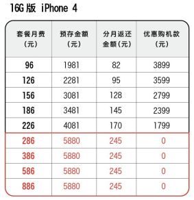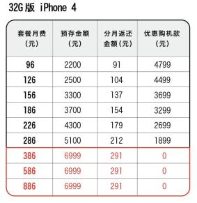其中16G版iPhone 4,售價5880元,32G版售價6999元。聯通公司分別為兩種機型定制了9種套餐,用戶承諾月消費286元以上即可0元購得16G版iPhone 4。而如想要0元購得32G版iPhone4,則需要最少月消費386元。
