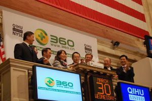 3月30日晚9點多,奇虎360登陸紐約交易所,代碼QIHU,發行價14.5美元,開盤就高出86.2%達到27美元,之后股價一路飛漲,最后以34美元收尾,大漲134%,總市值達39億美元。