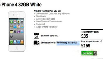 據上述報道稱,英國移動通信運營商3電信公司日前在其在線商店內專門放出了一個白色iPhone 4智能手機產品頁面,合約時間24個月。據稱3電信公司允許消費者即刻通過網上購買方式,購買白色32G版蘋果iPhone 4智能手機,同時最早發貨時間鎖定在4月20日。