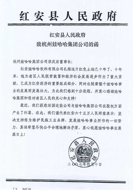 經濟觀察網訊 10日,湖北紅安縣人民政府致函杭州娃哈哈集團公司,支持娃哈哈。