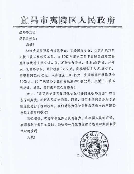 經濟觀察網訊 12日,湖北宜昌市夷陵區人民政府致函杭州娃哈哈集團公司,支持娃哈哈。