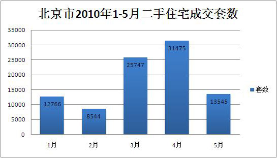 根據北京房地產交易管理網數據,本報統計得出,北京一手住宅成交量4月為12187套,5月為6269套,比4月減少5198套,成交量下降48.6%;而二手住宅成交量4月為31475套,5月為13545套,減少17930套,降幅達57%。