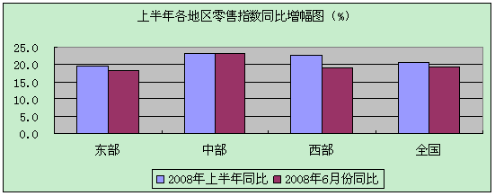上半年,中部、西部、東部地區核心商業企業零售指數同比分別增長23.3%、22.6%和18.4%,中、西部地區分別高出東部3.7和3個百分點。