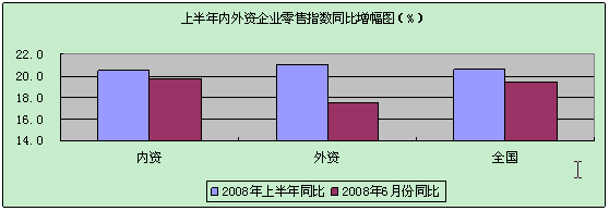 上半年,內、外資核心商業企業零售指數同比分別增長20.5%和21%,外資企業高出內資企業0.5個百分點。