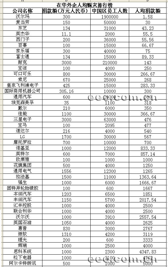 本網根據截止至5月19日的公開數據,編輯了部分在華外企人均賑災排行榜,并以人均捐款額度作為考量的指標之一。
