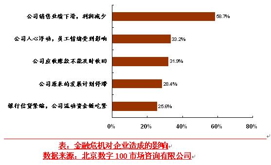 經濟觀察網 記者 嚴鈺 全球經濟疲軟大背景下,中國企業首當其沖受到影響。據北京數字100公司市場咨詢有限公司數據調查顯示,80%人群認為所在企業受到金融危機影響;58.7%人群認為金融危機造成企業銷售業績下滑、利潤減少;另外,調查顯示制造業、金融業、商業服務業、房地產業這四大行業在危機中損傷最大。