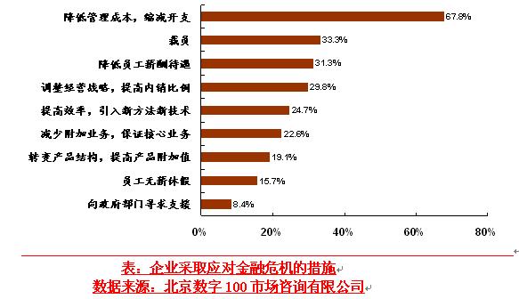 另外,調查發現,在金融危機的沖擊下,各企業都采取了積極的措施力圖減小危機帶來的負面影響,在各項措施中“降低管理成本,縮減開支”成為企業的主流選擇,有67.8%的受訪人群選擇了該項,同時“裁員”、“降低員工薪酬”等短期的應對措施選擇的比例也較高,相對來看,像“轉變產品結構、提高產品附加值”這樣長期的戰略性調整則較少的被企業采用,同時“向政府部門尋求支持”也容易被企業所忽視。
