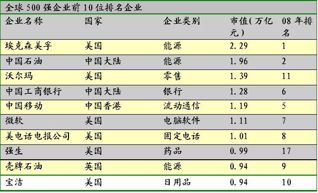 經濟觀察網 實習記者 姜宛君 據媒體報道,英國《金融時報》最新公布09年度全球500強企業排行榜。能源類取代銀行業成為最值錢行業,其中??松梨诩爸袊头謩e蟬聯冠、亞軍。