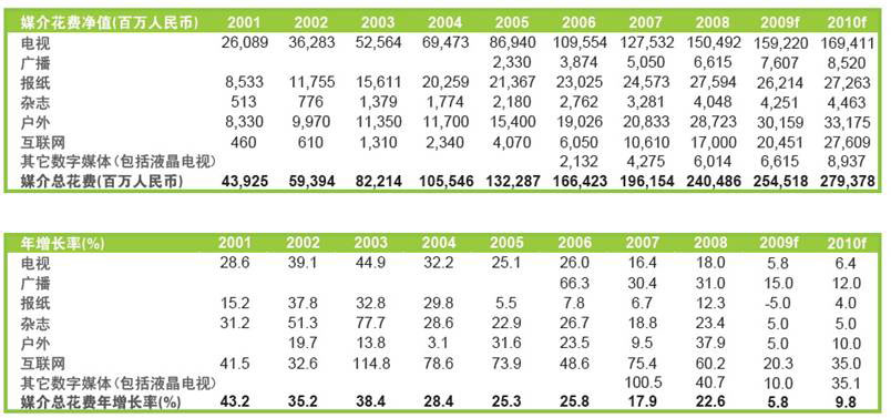 2009年中國媒體市場廣告花費增幅可達5.8%,花費額將增至2545億人民幣,2010年增幅預計將達到9.8%。今年6月,群邑對今明兩年的增幅預計為3.2%和8.9%。