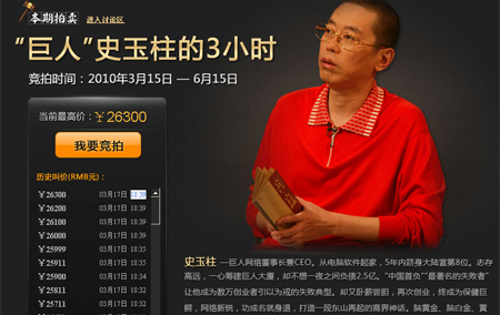 在優米網首期名人拍賣中,競價最高者將獲得與史玉柱對話三個小時的機會。拍賣開始后不足兩個小時內,競價已突破萬元。
