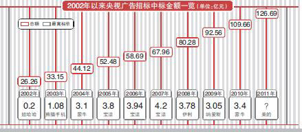 經濟觀察網 見習記者 劉丹 昨日晚8點,2011年中央電視臺黃金資源廣告招標結束,招標預售總額是126.6870億元,比去年109.6645億增長了17.0225億元,增長率為15.52%。這個數字創造了中央電視臺十七年招標預售總額的又一個新高度。