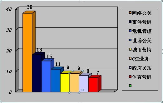 據悉,這40家公司中的38家開展網絡公關業務(95%),18家開展事件營銷業務(45%),15家開展危機管理業務(37.5%),11家開展世博業務(27.5%),9家開展城市營銷業務(22.5%),9家開展CSR業務(22.5%),8家開展政府關系業務(20%),7家開展體育營銷業務(17.5%)。