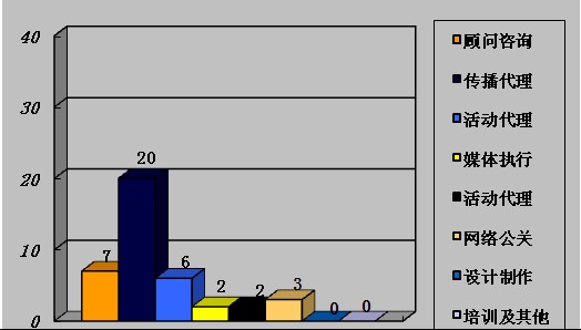 40家公司中,22家以傳播代理和執行為主,8家以活動代理和執行為主,7家以顧問咨詢為主,3家以網絡公關為主。上述數據表明,傳播代理業務仍是公關公司的主要業務,以信諾傳播為代表的活動傳播類公司也占據了約20%的市場份額,特別是在地區市場中表現更為明顯。