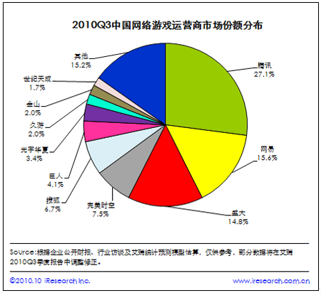網絡游戲市場集中化保持不變,騰訊、網易、盛大位列三甲,總份額占整個市場的57.5%