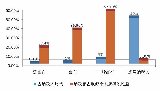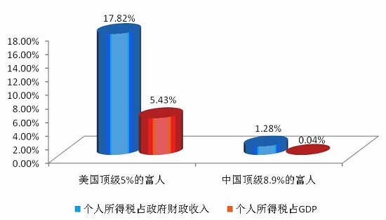 而據中國財政部稅政司2010年2月公布的數據,中國2009年個人所得稅為3949.27億元。這其中到底有多少是頂級富人所繳納的?官方并未進一步公布,但我們還是可以大體推算出來。據媒體報道,截至2010年3月31日申報期結束,全國共有2689150人到稅務機關辦理2009年度個人所得稅,申報稅額為1384億,占2009年度政府所獲得的個人所得稅收入總額的35.5%。這2689150人是否就是當前最富有的5%人士?所繳納的個人所得稅占其收入的比例是多少?政府并沒有做出解釋,媒體也沒有給出更為具體的說明,可我們還是可以計算出一個大概情況。首先,這2689150納稅人應該屬于最富階層;而依據中國學者的研究,中國目前實際可繳納個人所得稅的人數不過為2000萬到3000萬。因此即使保守地看,也就是按照3000萬來計算,這2689150納稅人所占的納稅人比例大約為8.9%。再據中國國家統計局2010年7月02日所公布的修正數據,2009年中國GPD總量是340507億;據中國社科院公布的《中國財政政策報告(2010-2011) 》,2009年中國政府的全部財政收入為108000億。由此推算,中國占納稅人8.9%的富人2009年所繳納的個人所得稅,僅僅占GDP的0.0406%,占政府財政收入的1.281%。