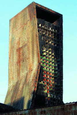 大樓表面一片焦黑之下萌發出些許紅紅綠綠的生氣,頗似一件經典的行為藝術作品,也很有些西方油畫的味道。