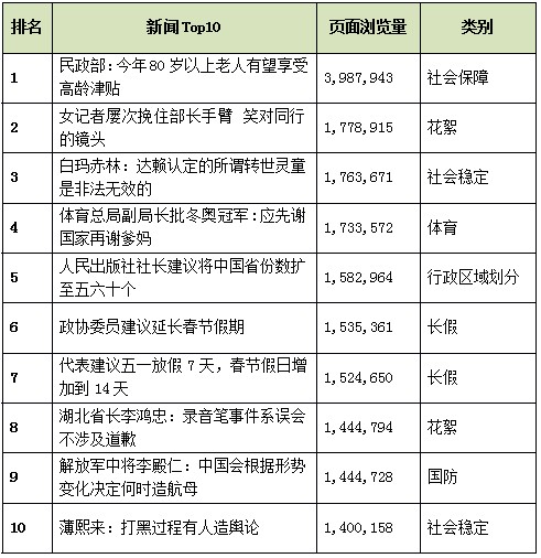 (注:數據來自萬瑞數據,其數據平臺監測新浪網,搜狐網,網易,鳳凰網,和訊網,TOM,千龍網,和訊7家網站的兩會專題。以上數據是3月3日至13日期間,每條新聞發布當天的點擊量。)