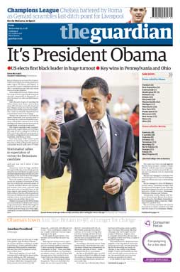 于是報紙一般采取兩種手段應付。第一種辦法是猜測選舉結果,在頭版上加上語義模糊的頭條。今天所有英國報紙的頭版,都是奧巴馬的照片,《衛報》和《每日電訊報》采用的是同一張拍攝于奧巴馬參加投票后的照片,其它報紙有的采用神采飛揚的奧巴馬,有點采用做深思狀的奧巴馬(《獨立報》),或者是各地投票站的投 票人群組合(《金融時報》)。標題大都采用“歷史性的”、“等待中”、“決定”、“新的黎明”等暗示語。所有媒體都猜測奧巴馬會贏。當然這種做法,一旦猜 錯,會搞得自己很難看。在民主黨新罕布什爾州初選時,《獨立報》就在頭版放上奧巴馬大幅照片,結果是希拉利勝出。