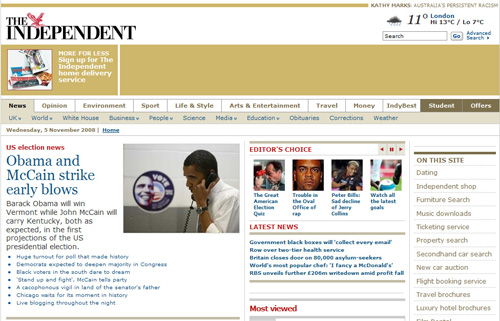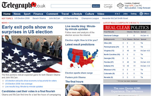 當報紙在努力變成“媒體平臺”時,英國的電視臺也在向網絡發展,在這方面,英國的兩大電視新聞網絡中,BBC的網站比Sky News 好很多。BBC 的美國大選專題雖然仍然局限在網站現有模板中,但畢竟設計簡介、重點突出。Sky News 網站的設計,不僅簡陋壓抑,而且難以讓訪問者一下子抓住重點,置身故事情節中,而只有一堆分散而雜亂的信息。