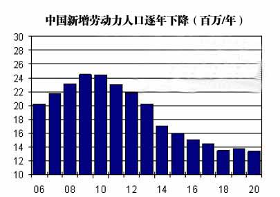 據估計,中國勞動人口的年均增長將在2009年見頂,年新增勞動人口達到2450萬。這一數據此后將逐年遞減,至2018年左右穩定在1350萬的水平。這意味著中國的經濟增長將開始放慢,勞動力人口增長的放慢拖累了GDP增速。中國政府根據就業崗位需求而制定經濟增長目標,2008年GDP增長的目標為10%左右,這將在城鎮地區創造1000萬個就業崗位。