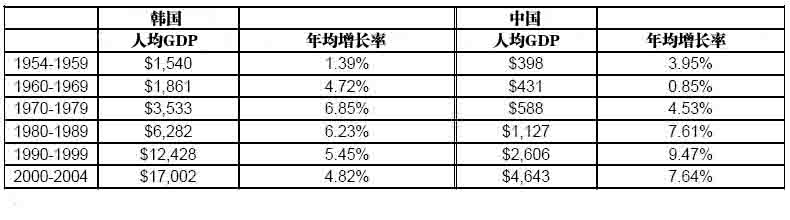 韓國人均GDP的增長率在上世紀70年代到達峰值,數值為6.85%。其人均GDP在1970年代為3533美元。此后,韓國每十年的增長率一直在下降。與此同時,如果按相同的發展階段進行比較,中國的增長速度遠超過韓國。在1990年代,中國的人均收入為2606美元,年均增長速度為9.47%。而從2000年至2004年,中國人均收入增長率降至7.64%;但隨著名義GDP的上升,人均GDP在未來幾年仍有望反彈。