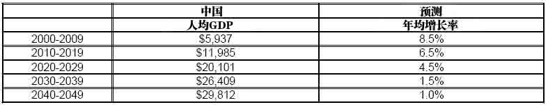 從歷史經驗中,我們可以預測中國未來的經濟增長速度。從1980年到1989年,美國人均GDP增長率為2.1%,到1989年達到了26982美元。日本和德國更是與中國相似。到2020年,中國的人口狀況將更類似于上述兩個國家,而從2030年開始,這種人口結構將不利于經濟增長。和中國一樣,日本和德國的經濟也高度依賴制造業的出口。日本人均產出率在2000至2004年增長0.8%,達到24660美元。而德國人均產出率每年增長0.5%,2004年達到25610美元。據此,中國到2050年時的人均GDP數字預測值如下: