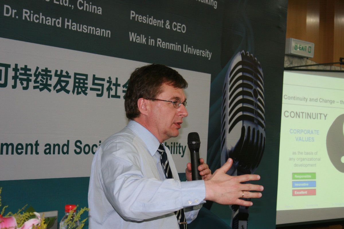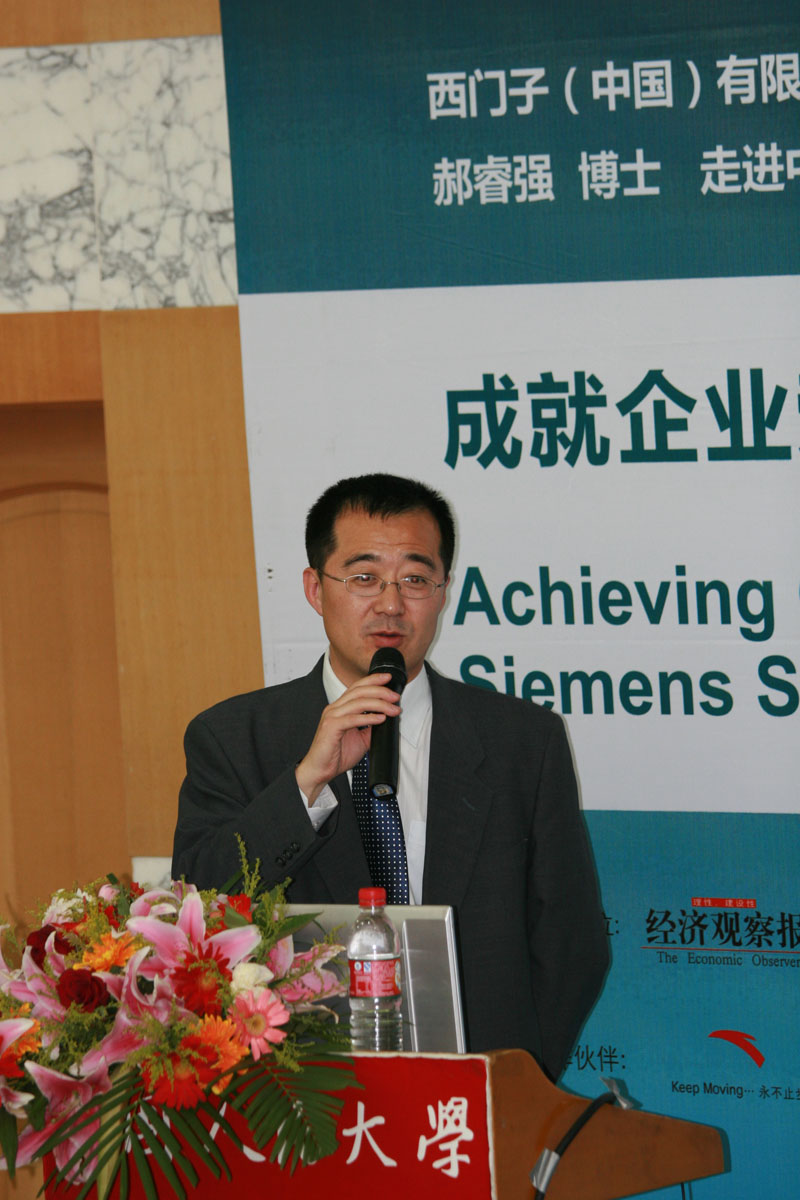 我們今天有幸請到了西門子(中國)有限公司的總裁兼首席執行官,他的中文名字叫做郝睿強。除了他,還有我們人民大學商學院的陳甬軍副院長。另外,《經濟觀察報》報社的副社長陳輝先生也出席了今天的論壇。在座的其他還有我們的一些工作人員。今天我們把最后總受尊敬企業走進高校的系列活動走進了人民大學。此前,我們都是在中國的各個最一流的大學里進行巡講。我主持過幾次,但是第一次到人民大學,對此感到很榮幸,謝謝大家捧場。