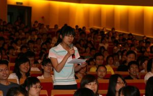 第一條叫“強烈的愿望”;第二條叫“明確的方向”;第三條叫“具體的目標”;第四條叫“有效的方法”;第五條叫做“頑強的意志”;第六條叫做“長期的努力”。各位南開的同學,如果我們向賈樟柯導演學習,把這六條作為參考,肯定在座的600多人一定也會出現許許多多的優秀分子,為南開爭光、為這一代青年人爭光,我先和大家分享到這兒,謝謝大家!
