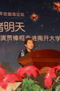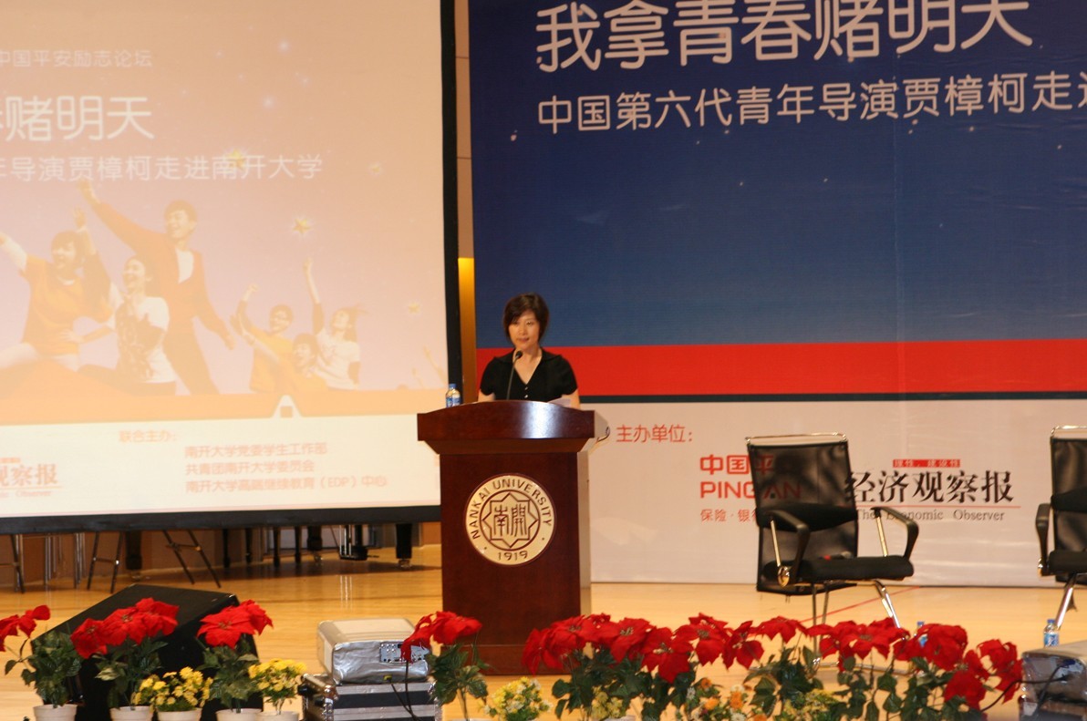 楊克新:尊敬的各位來賓、老師們、同學們,大家晚上好!在南開大學喜迎90周年校慶之際,我們非常高興的迎來了“中國平安勵志論壇2009年度南開之旅”活動。在此,我謹代表南開大學向活動的主辦方中國平安保險公司和《經濟觀察報》致以衷心的感謝!向出席今天活動的主講嘉賓賈樟柯先生表示熱烈的歡迎和衷心的感謝!同時也歡迎和感謝程社明教授及各位來賓出席今天的論壇活動!