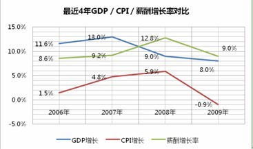 不同于以往數年,自2008年8月起全球性經濟危機持續對各個行業實體經濟進行沖擊,無論是宏觀經濟指數還是企業內部經營領域均出現了不同程度業績增長放緩甚至衰退的跡象。對比2006-2009年度GDP/CPI指數、薪酬增長率的變化趨勢,我們不難發現,進入2009年度以來,隨著CPI指標的持續低位,企業所面臨的由于外部物價指數上漲而引發的薪酬成本上升的壓力逐步降低。