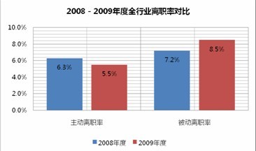 通過太和顧問數據分析,2008-2009年度間,員工的主動離職率下降了0.8個百分點,而由于企業裁員、崗位合并等原因導致的被動離職率上升了1.3個百分點。太和顧問認為常規的被動離職甚至裁員對企業凝聚力、員工心態、員工工作積極性等方面的負面影響較大,企業需要有針對性的配合內部上下級溝通、團隊建設、福利政策等一系列的員工關懷計劃輔助實施。