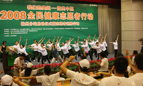 7月27日下午,浙江省人民大會堂里座無虛席。由國家體育總局、第29屆奧運會組委會正式批準,中華全國總工會、中國文學藝術界聯合會、中華全國婦女聯合會等八家中央級單位共同支持,衛生部新聞辦公室及中國健康教育協會全面參與,貴州益佰制藥股份有限公司全程協辦,《經濟觀察報》作為主辦媒體的全民健康大型公益性文化活動“我們的奧運——微笑中國2008全民健康志愿者行動” 杭州分站的啟動儀式在這里隆重拉開帷幕。在本次啟動儀式上,“益佰全民健康操”再次成為全場矚目的焦點,也是2008全民健康志愿者行動自全國啟動以來全民健康操推廣的第一個高潮。