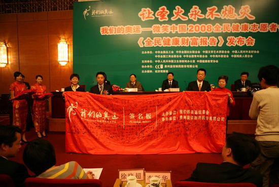 上圖:“我們的奧運—微笑中國2008全民健康志愿者行動”之《全民健康財富報告》發布會現場,組委會將志愿者簽名長卷贈送給活動全程協辦單位貴州益佰制藥。(是否可以加上翻書的圖)