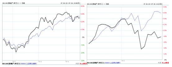 近一季度(左)和近一月(右)申萬房地產指數與上證綜指走勢對比