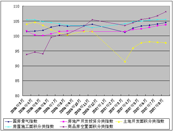 4.8月份,“國房景氣指數”為104.48,比7月份上升0.48點,同比上升1.17點;1-8月份,全國房地產開發企業資金來源增長35.1%,其中利用外資增長65.9%,全國房地產開發企業完成土地開發面積增長15.3%,全國房屋施工面積增長22.7%,全國商品房空置面積同比下降2.0%,其中空置商品住宅下降9.3%。從去年3月到今年8月的走勢來看,房地產景氣度穩中有升,但是土地開發面積持續減少,同時商品房空置面積持續增加。