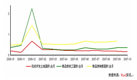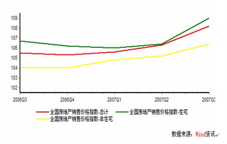 國家發改委統計數據顯示,至2007年10月份,全國70個大中城市房屋銷售價格同比上漲9.5%,其中新建商品房價格上漲10.6%,二手房銷售價格同比上漲8.7%。國家統計局數據顯示,2007年1-9月,房地產實際完成投資額16814億元,同比增長30.3%;完成開發土地面積1.82億平方米,同比增長11.3%;商品房施工面積19.99億平方米,同比增長22.41%;新開工面積6.67億平方米,同比增長21.6%;商品房竣工面積2.44億平方米,同比增長11.0%;商品房銷售面積4.74億平方米,同比增長32.0%;商品房銷售額18684.8億元,同比增長50.5%。