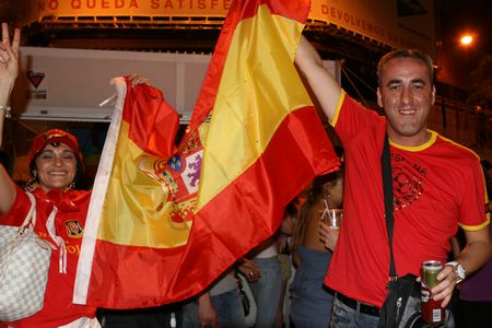 晚上十點鐘左右,西班牙人終于迎來了60年以后再次進入四強的好消息。慶祝的時刻由此開始,路上的出租車也開動馬達(當然同時也剎車),剎車片摩擦輪胎燃起的煙霧混和著馬達的聲響是球迷歡呼最好的背景和弦了。不過有意思的是,終場哨聲一響,警車就開始鳴笛,不知道是為了慶祝還是警告球迷別鬧事。