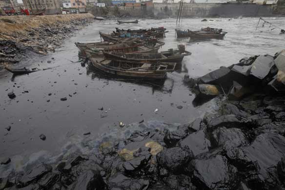 目前已有800余艘漁船工作在受污染的海域。這位漁民說,他們每天大概能撈到20多噸的原油。在鯰魚灣村的海邊,漁船船體被黑油包裹著。而漁民們的鞋子上也似乎被噴了一層黑乎乎的膠水,衣服上布滿了灰塵。