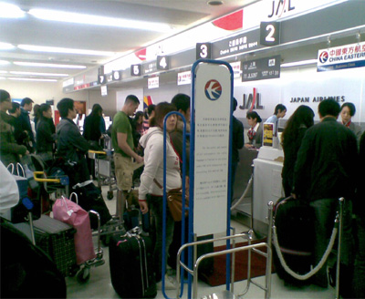 3月17日,位于日本最南端的沖繩縣機場內,狹小的出發大廳里到處都中國面孔。中午時分的兩班航班都是飛往中國上海,東航與臺灣中華航空公司的值機柜臺前很多人開始排隊等候。