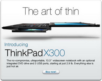 聯想近日打出一則ThinkPad X300的廣告又將二者越打越烈的口水戰推上高峰?!癊verything else is just hot air”(其它所有一切不過是熱“空氣”,hot air意指吹牛)的廣告詞直指蘋果MacBook Air。