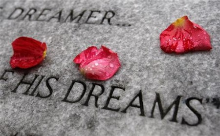 4月4日,美國田納西州孟菲斯,馬丁·路德·金的紀念碑上散落著玫瑰花瓣。REUTERS/Mike Segar 點評:這是讀圖時代一張讓人去讀的照片。帶著露珠的玫瑰花瓣打破了大理石的冰冷與單調,為畫面增添了活力,表達著哀思與懷念?!段矣幸粋€夢想》至今仍回蕩在人們的耳畔,成為英語世界最富感染力的聲音,具有啟示錄般的感召力。畫面上的“夢想家”、“他的夢想”象開篇辭一樣把人們帶入一切關于馬丁·路德·金和人類美好理想的思緒中。這樣的照片和思考是多么值得珍藏!(來源:路透社)