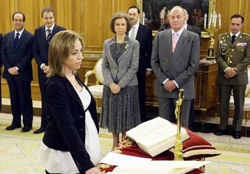 西班牙出現該國有史以來第一位女國防部長?,F年37歲的卡梅-查孔4月14日穿著黑色長褲和寬松的白色孕婦罩衫,外套一件敞開的深色短上裝宣誓就任國防大臣。這一任命被認為具有象征意義,體現了西班牙薩帕特羅新內閣落實“根除性別歧視”承諾,提高女性地位的決心。
